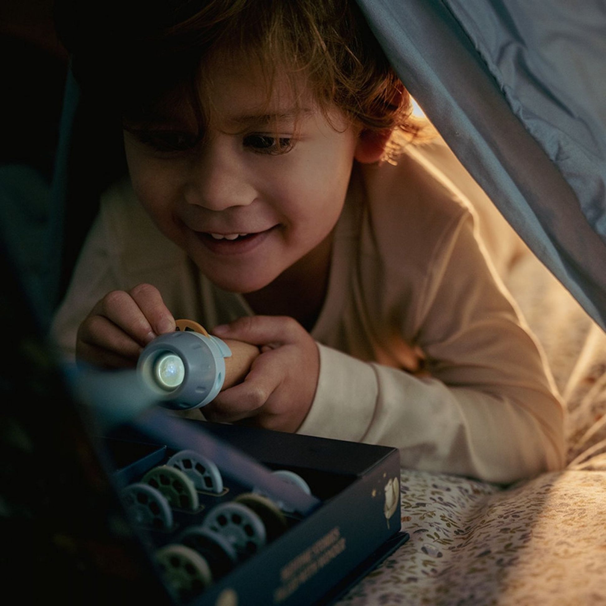 Émerveillez votre enfant avec cette lampe de poche projecteur d’histoires. Chaque disque raconte une histoire différente, projetée sur le mur grâce à de magnifiques illustrations uniques. Chaque récit est accompagné d’un livret pour enrichir l’expérience.