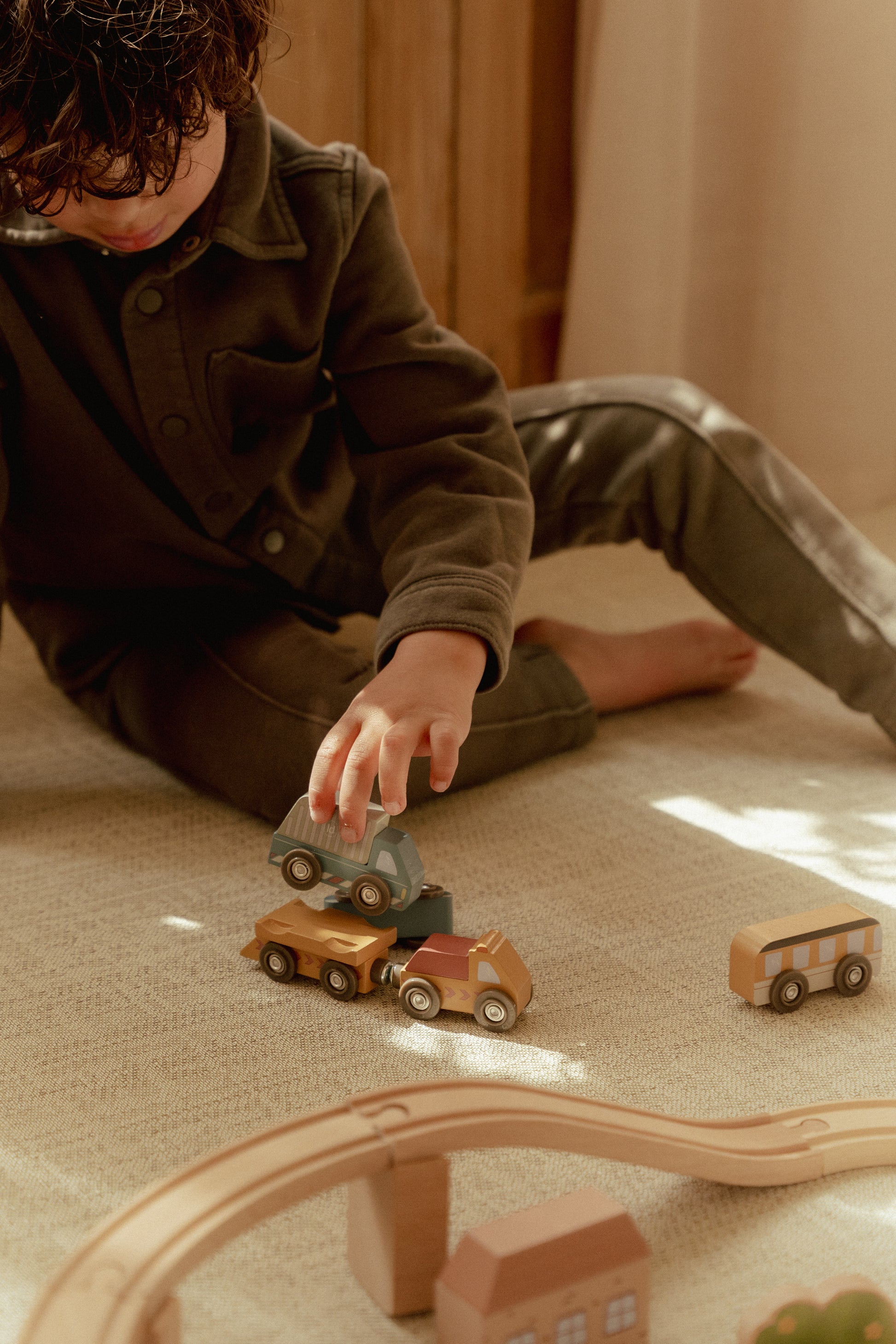 Ces véhicules en bois (pompiers, police, ambulance, camion et camionnette de livraison) sont prêts à intervenir à tout moment. Conçus pour rouler sans effort sur les rails, ils apportent de l’aide et de l’action dans toutes les situations.
