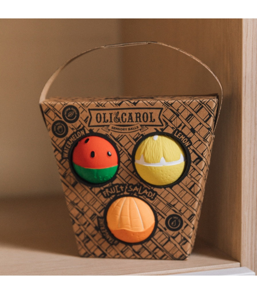 Ce set de balles sensorielles Salade de Fruits promet des moments de jeux colorées et juteux ! Retrouvez : une pastèque rafraîchissante, un citron acidulé et une mandarine sucrée.